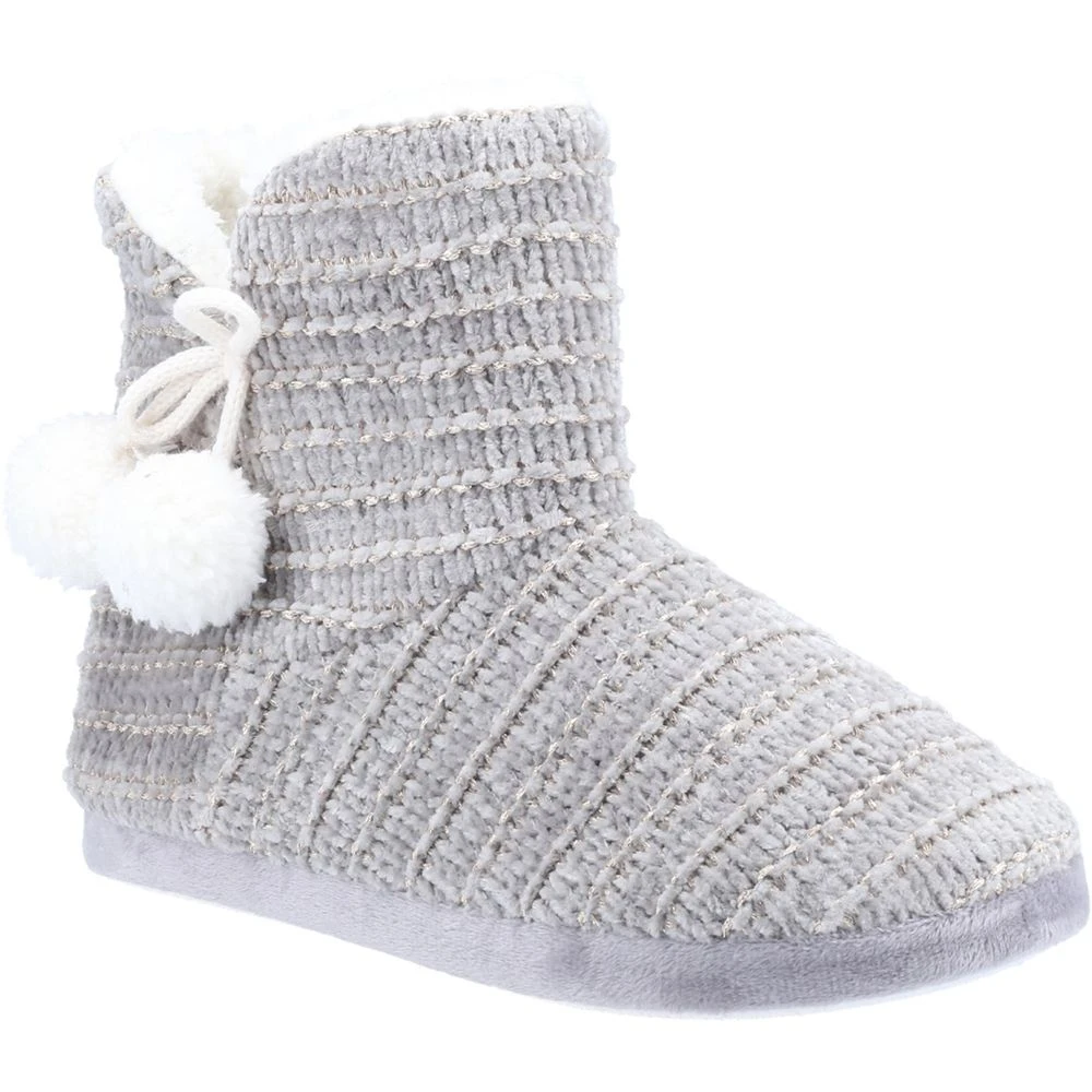 - Pull on bootie slipper with wide v-neck side openings. Soft faux fur lining and sock ideal for barefoot wear.