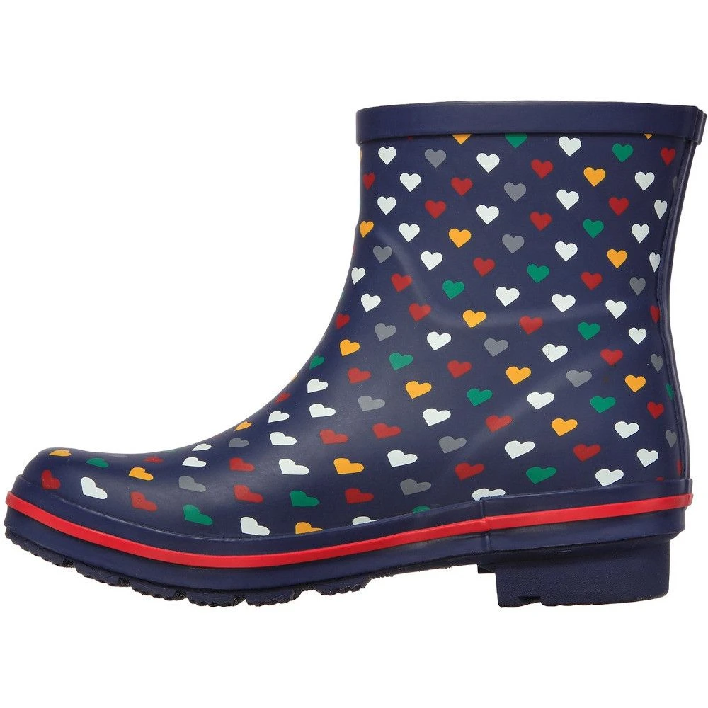 - Multi colored hearts with contrast colored midsole trim. Slip on casual low mid calf height rain boot design.