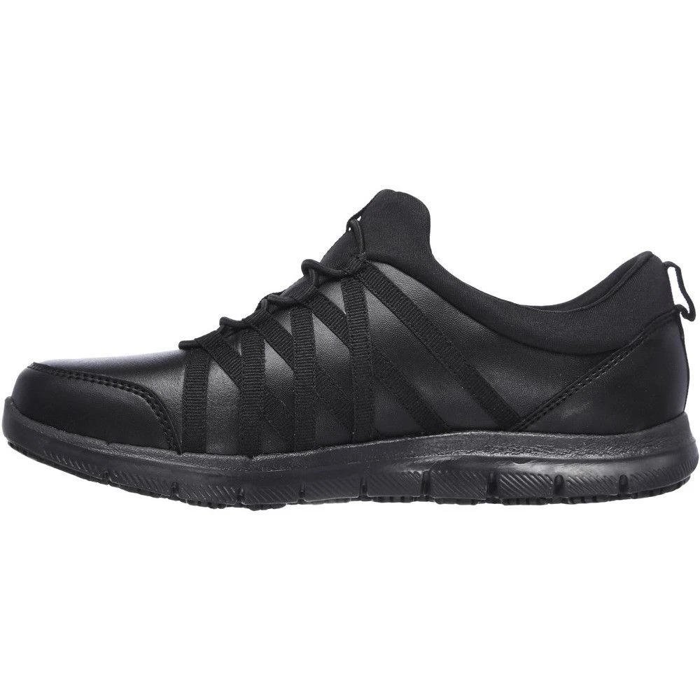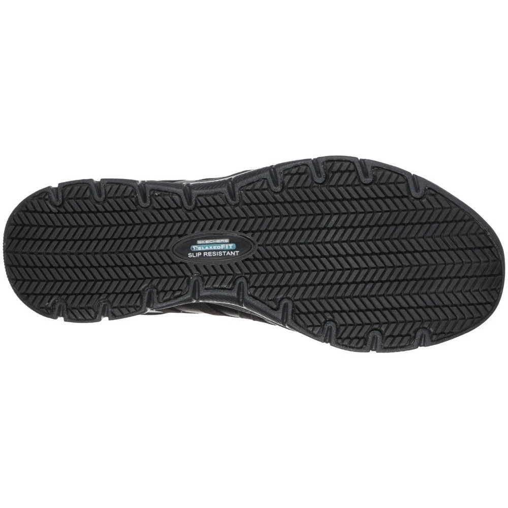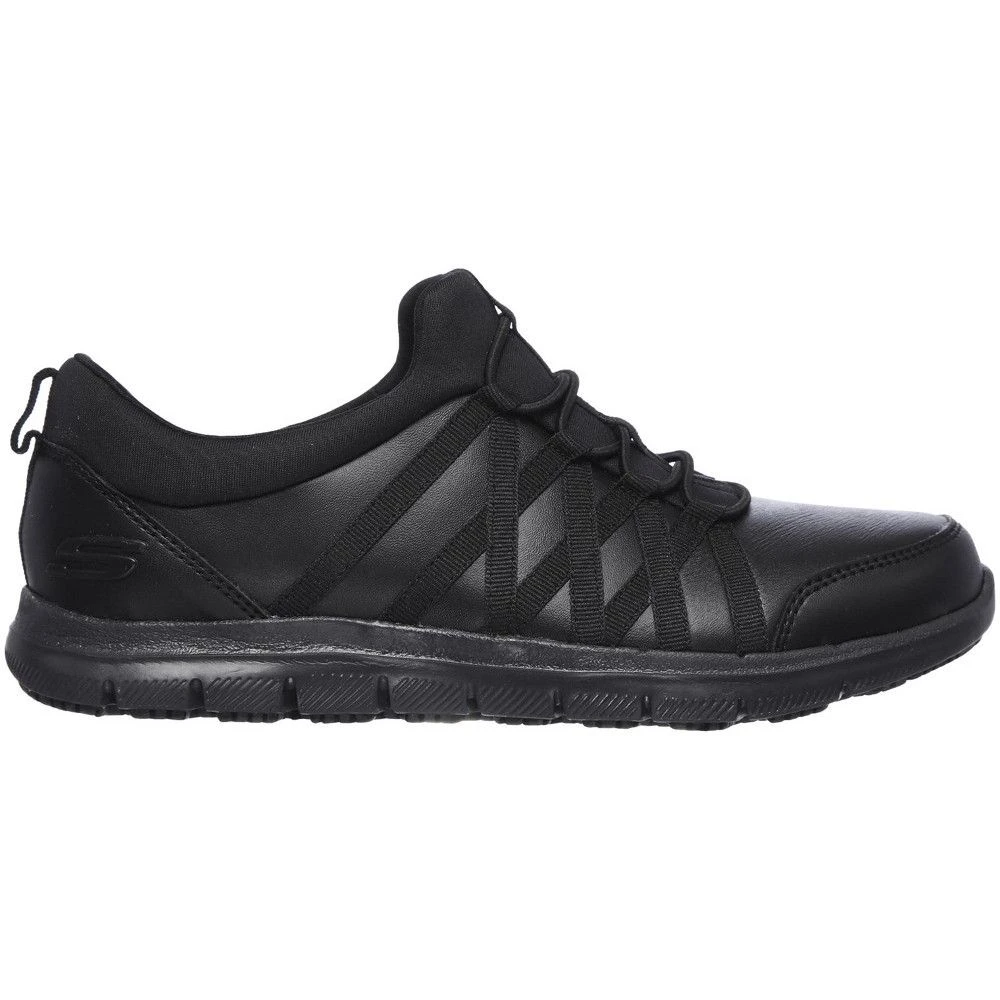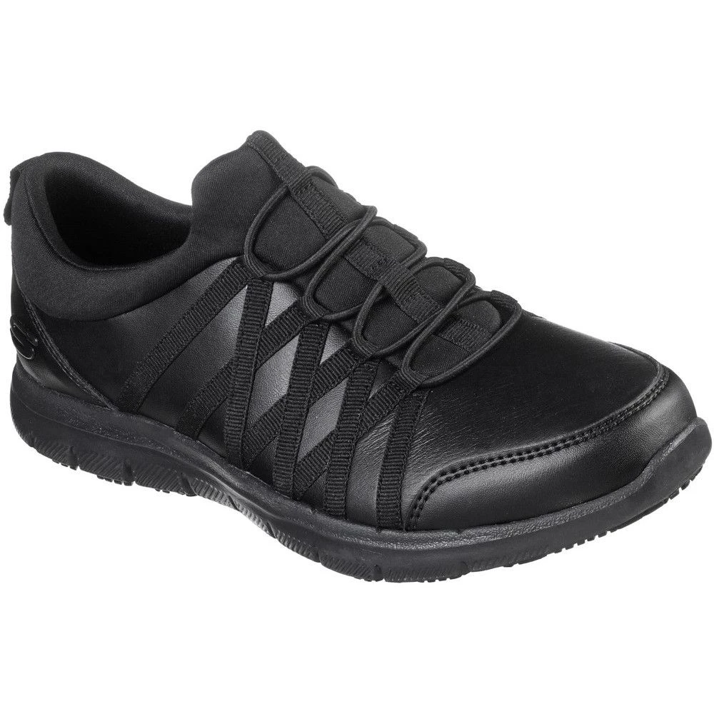 The Skechers Ghenter Dagsby Womens safety shoes are the perfect mix of style and protection. This slip-resistant sneaker features a smooth leather upper with a slip-on bungee-laced front and a Memory Foam cushioned comfort insole. The slip-resistant traction outsole provides extra protection in those slippery, oily work environments.